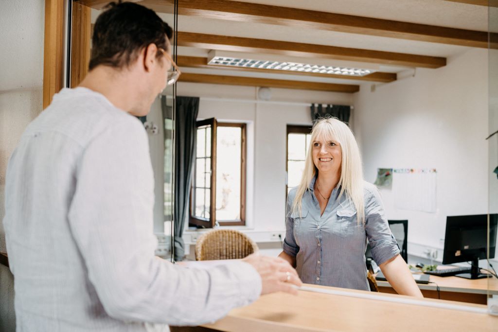 An der Rezeption werden Sie freundlich empfangen. Unser Team hilft Ihnen mit dem Gepäck und begleitet Sie zu Ihrem Zimmer. Auf den Gängen begegnen Sie herzlich grüßenden Menschen – ein erster Eindruck unseres achtsamen Miteinanders.